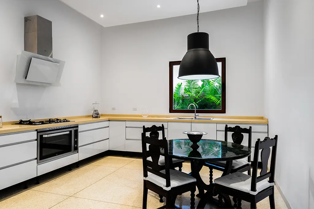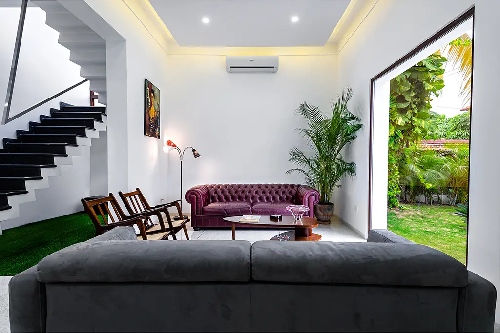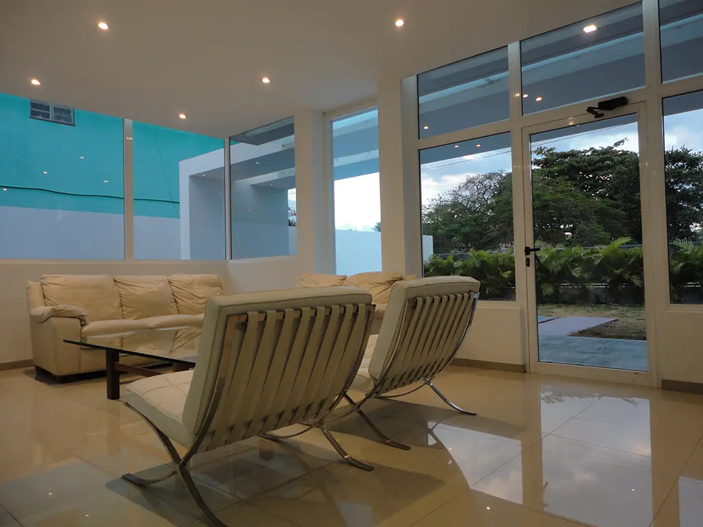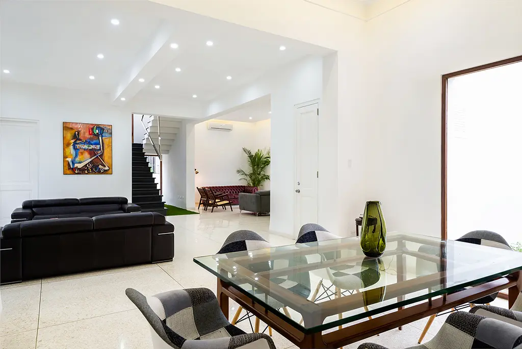 Vivienda de 2 niveles ubicada en el Municipio Playa. Las acciones constructivas de esta vivienda fueron dirigidas a remodelar, adecuar y ampliar todos los espacios interiores y exteriores incluyendo el cercado perimetral, terraza interior abierta al exterior semitechada con espejo de agua. Se lograron desconetar algunos muros (ver imagen de la escalera), asi como crear lucernarios en la planta alta para mayor iluminacion natural. Se aplicaron materiales contemporaneos.
